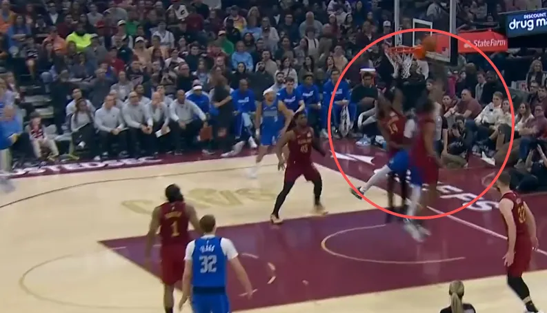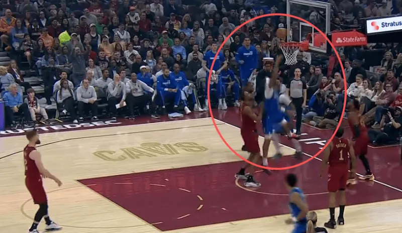 推球变向启动突破,行进间右手大力炸球后转身合球抹入近框区域直接起抛投终结,稳稳命中。